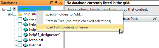 - ツリーを再更新 (チェックされた選択は維持する): 現在のデータベースサーバーツリーを再ロードします。最初のロード以降選択したフォルダに新しいサブフォルダやデータベースが新たに作成されたものがあれば、表示されます。ディレクトリーとデータベース選択は保持されます。