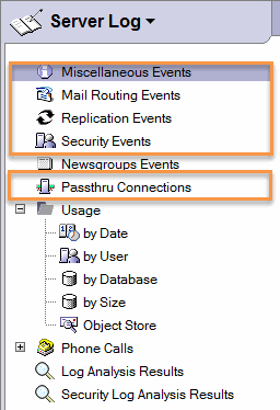 ログ分析は、サーバーの log.nsf から次のカテゴリのすべての情報をスキャンします: その他イベント、メールルーティングイベント、複製イベントとパススルー接続。