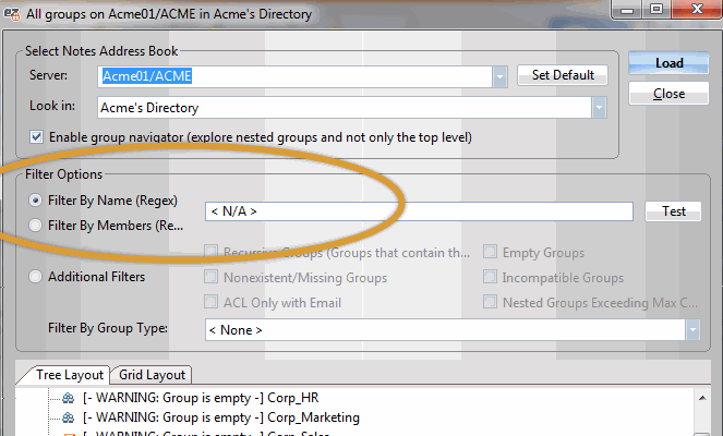 グループタイプ別のフィルタ: 追加のフィルタを使い、ある種類のグループのみをロードします。