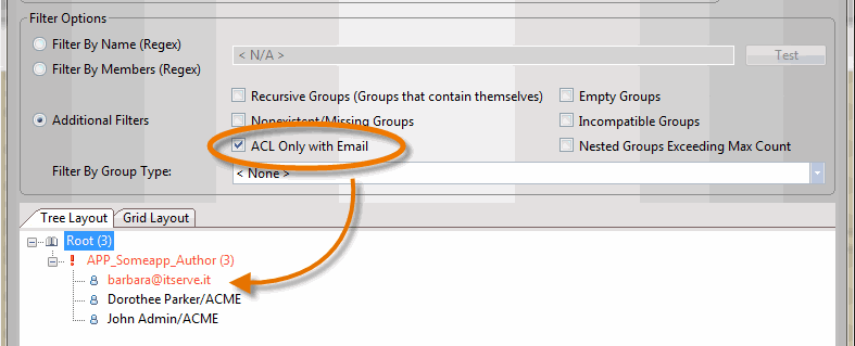 Email アドレスを含むグループタイプ「ACL のみ」ををフィルタ