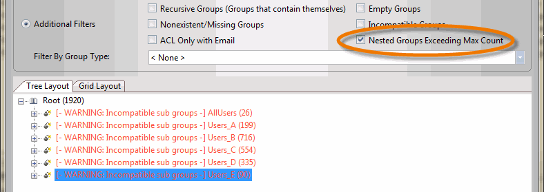 このフィルタを有効にすると、ネストの階層が 20 を超えるグループを表示します。