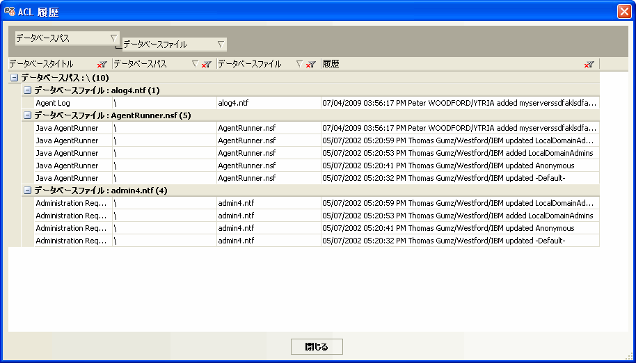 [履歴]:この列のボタンをクリックすると、Lotus Notes の [アクセス制御リスト] ウィンドウの [ログ] タブに表示される情報が表示されます。ログウィンドウの例については、図 3 を参照してください。