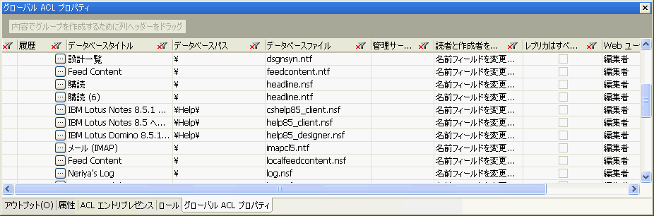 [グローバル ACL プロパティ]パネルでは、通常 Lotus Notes の [アクセス制御リスト] ウィンドウの [詳細] タブと [ログ] タブに表示される情報をすぐに表示および変更できます。まだ表示されていない場合は、