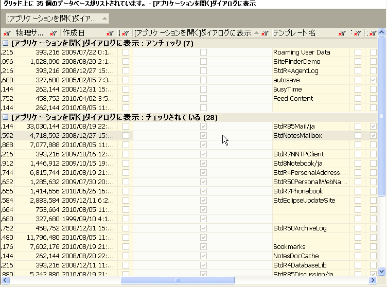 databaseEZ のグリッドペインでは、「[アプリケーションを開く] ダイアログに表示」プロパティで分類しています。  背景が黄色のセルは、それらのプロパティが要約情報から収集されたことを示します。 |