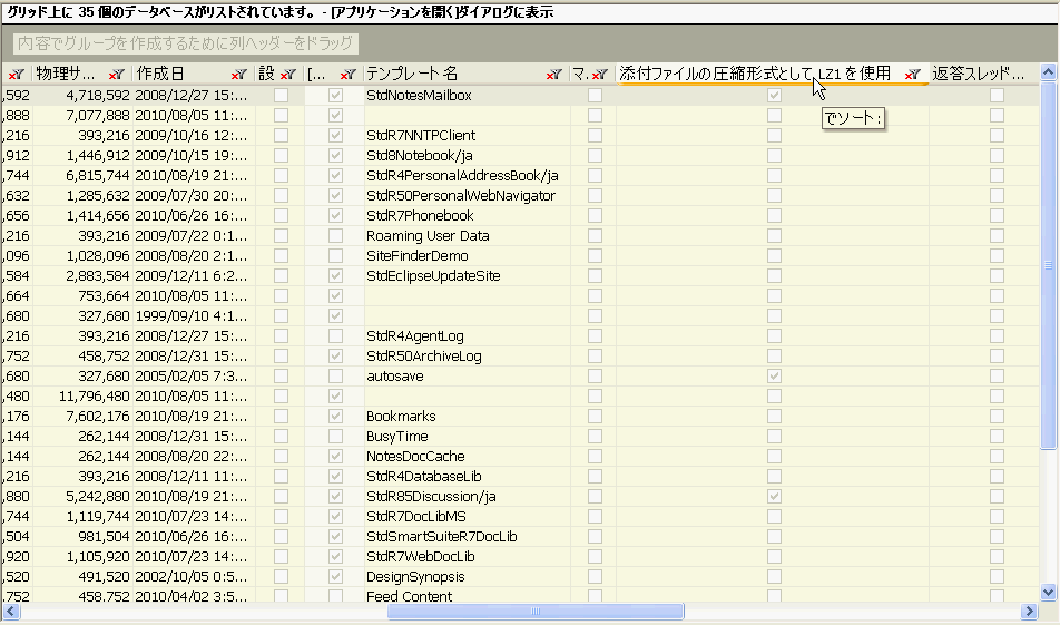 Ytria databaseEZ では、グリッドペインと呼ばれる、スプレッドシートに類似したインターフェースを使用して、グローバル NSF プロパティ情報を表示します。Ytria の製品ラインで使用できるグリッド機能の詳細なガイドについては、こちらを参照してください。 databaseEZ のメイングリッドの各行は Lotus Notes データベースを表します。データベースのプロパティは、さまざまな列の下に表示されます。 グリッドにデータを挿入するには、[データベース] パネルで一部またはすべてのデータベースを選択します。 [データベース] パネルでデータベースを選択すると、グリッド内の一部のプロパティの背景が黄色になります。これらは要約情報を使用して収集されたプロパティで、非常にすばやくロードされます。このような高速性のほかに、要約情報を使用すると、アクセス権のないデータベースのプロパティも表示できます。