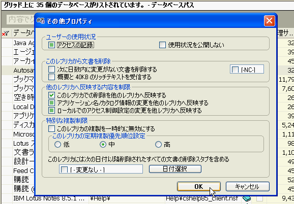 [編集] > [データベースその他プロパティ編集] をクリック(またはグリッドペインで右クリックして、コンテキストメニューの データベースその他プロパティ編集] を選択)すると、[その他プロパティ] ダイアログボックスが表示されます。 このダイアログボックスでは、Lotus Notes の [複製の設定] および [ユーザーの使用状況] ダイアログボックスに関連するプロパティを一括編集できます。 複数のデータベースが選択されている場合は、このダイアログボックスのチェックボックスに現在の設定のステータスが示されます。