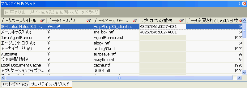 プロパティ分析グリッド [設定を保存し分析実行] をクリックすると、プロパティ分析でスキャンされたプロパティと一致するデータベースがグリッドに表示されます。 プロパティ分析グリッドは、すべての標準グルーピンググリッドの並べ替えオプションとフィルタオプションを備えています(グリッドの機能の詳細については、こちらを参照してください)。また、右クリックして表示されるコンテキストメニューには、グリッドペイン内のデータベースを選択できる [メイングリッドに表示] オプションもあります。  |