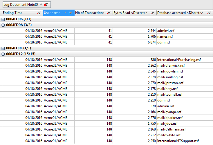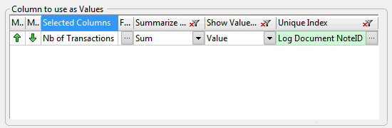 結果として表示されるピボットテーブルには、似たような複数の Index (同じ値を有するすべての Log Document NoteID)を除外して表示されます。