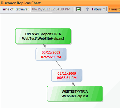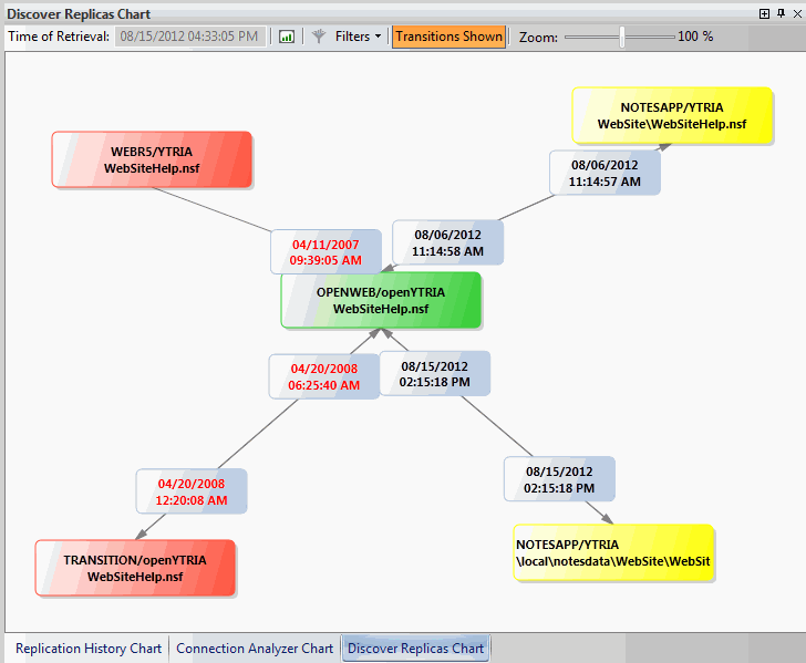 レプリカの検索スキャンを実行すると、結果が [レプリカの検索] パネルグリッドと [レプリカの検索チャート] の両方に表示されます。 このチャートは複製履歴情報を分析して、「このデータベースはどこに複製されているか」、「このデータベースのいくつのレプリカにアクセスできるか」などの疑問に対する簡単で視覚的な回答を提供します。