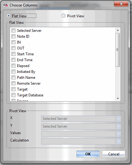 ログ分析を行う 1 つまたは複数のサーバーを選択すると、[列の選択] ダイアログが表示されます。ここでは [フラットビュー] (通常のグリッドタイプの表示) または [ピボットビュー] (スプレッドシートアプリケーションのピボットテーブルと同種のもの) を選択できます。