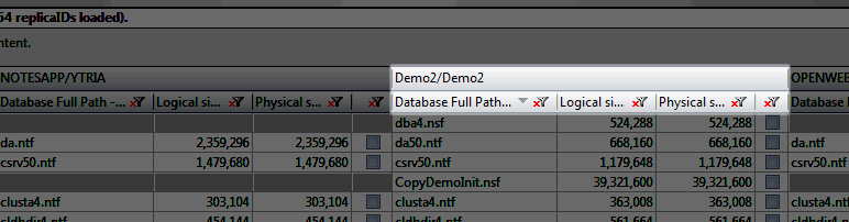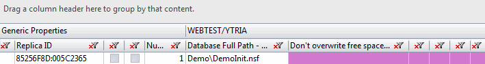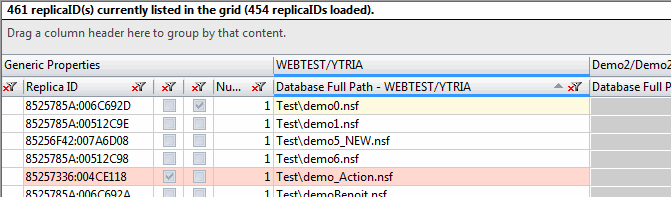 このメイングリッドのもっとも基本的な使い方は指定したデータベースのレプリカをどのサーバー上に存在するかを確認できます。Ytria ツールのグリッドタイプインターフェースをよくご存じであれば replicationEZ のメインスクリーンの列の取り扱いが少しだけ他と違っています。このスクリーンは半固定でトップレベルの「親ヘッダー」の下に列ヘッダーが現れます。 データベースパネルでファイルを指定した場合、その関連するレプリカ ID はメインスクリーンの「一般のプロパティ」親ヘッダー(デフォルトでは一番左)の下に表示されます。 メイングリッドはデータベースパネルにロードされたデータベースをリストします; 選択データベースのレプリカはそれらが存在するサーバーの名前の親ヘッダーにリストされます。 replicationEZ のメイングリッド (レプリカグリッド)