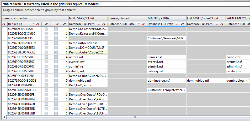 他の Ytria ツールでのグリッドタイプのダイアログをよくご存じなら、今回新しい表示方法である半固定のトップレベルの親ヘッダーが導入されたのが確認できます。それぞれのサーバーで最大で 5 つ(グリッド内の表示データ選択パネルで指定すれば)のデータベースプロパティを表示する新しいアプローチです。次のイメージでは、それぞれのサーバーのデータベースパスやその他プロパティが「親ヘッダー」に表示されているところです。