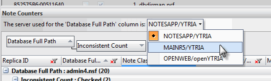 - [サーバー 1] [サーバー 2] [その他]: [データベース] パネルで開いている各サーバーに対応して表示される列もあります。これらの列のセルには、そのノートクラスについてのサーバーのカウントが表示されます。そのサーバーにレプリカがない場合は、このセルは灰色で表示されます。