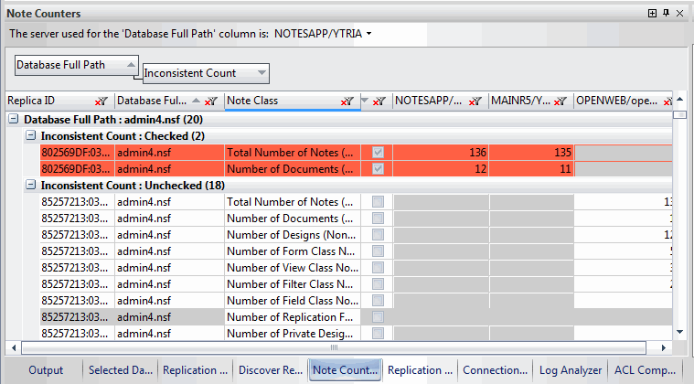 replicationEZ のノートカウンターツールはサーバー間のレプリカの内容を比較して不整合を検出します。 ノートカウンターツールの使用方法