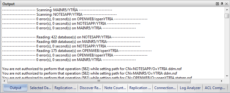 replicationEZ の [アウトプット] パネルは、アクセスエラーや読み取ったデータベースの数のような、イベントや発生した問題の記録を表示するために使用されます。